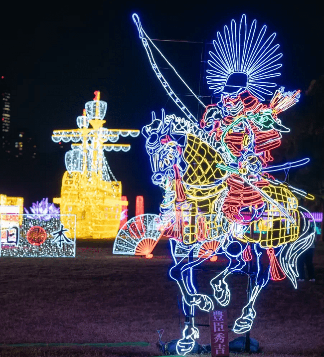 Ngoài ra, còn có những chiến binh được chiếu sáng như người thật. Đó là tướng Kato Kiyomasa, Sanada Yukimura, Ishida Mitsunari, Maeda Toshiie… những vị tướng samurai giúp lãnh chúa Toyotomi hiện thực hóa giấc mơ thống nhất Nhật Bản. Ban tổ chức sẽ thắp sáng các bộ giáp của những vị này, biến lâu đài thành nơi lịch sử và ánh sáng hội tụ, đưa bạn vào câu chuyện sống động về tham vọng, lòng trung thành và huyền thoại.